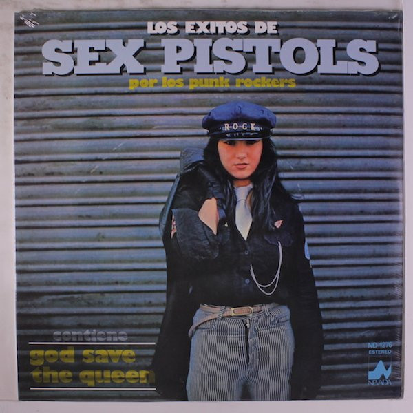 The Hollywoodization of punk was even more grim, serving as a shock tactic to mobilize parents into some sort of protection mode for their assumed-egg-shelled minded kids as well evidenced in the made-for-TV flick The Day My Kid Went Punk, where Bernie Kopell (Doc from The Love Boat) and his missus scheme to get their son through “his phase.” A remarkable audio document also remains in Los Exitos de Sex Pistols, a stunning Spanish K-Tel styled LP looking to cash in on the craze by arming a faceless bunch of studio musicians and a piss-poor Johnny Rotten impersonator to take on the whole of Never Mind the Bollocks in fierce-but-n0t-quite-there style. Example: “I’m a lazy sod” becomes “I’m a lazy seven”, their take on “Pretty Vacant” partially abandons the lyric sheet (“We’re so pretty/oh so pretty/we will cut her” (?)). Incidentally, probably the best appropriation of the Pistols I just discovered as a “band” called Six Pestos, whose Never Mind the Bolognese “release” is pretty much the entire LP sped up times three turning into a gabber-inflected carcrash keeping the sung phrases intact. Genius!